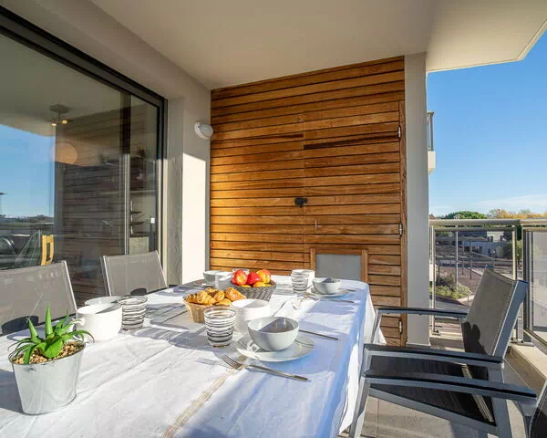 Die Ferienwohnung umfasst 43 m² auf zwei Ebenen und bietet Platz für bis zu 4 Gäste in 1 Schlafzimmer und 1 Badezimmer. Im zweiten Obergeschoss befindet sich das Schlafzimmer mit einem Französischen Bett (160 cm × 200 cm) sowie das Wohnzimmer mit einem Schlafsofa (140 cm × 190 cm). Die offene Küche ist in den Wohnbereich integriert und verfügt über einen Ofen, 3 Kochfelder aus Glaskeramik, eine Geschirrspülmaschine, eine Mikrowelle, einen Toaster, einen Wasserkocher, eine elektrische Kaffeemaschine und einen Gefrierschrank; ein Esstisch ist vorhanden. Das Badezimmer ist mit Dusche und WC ausgestattet. Eine private Terrasse von 13 m² ist vom Wohnzimmer direkt zugänglich und mit Terrassenmöbeln ausgestattet.