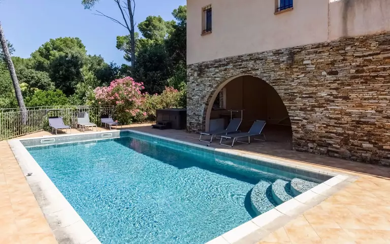 Bormes Les Mimosas: Schöne, komfortable Villa "Villa Cap Bénat", auf 2 Stockwerken. Im Ortsteil Cap Bénat, ruhige Lage in einem Wohnquartier, 400 m vom Meer, 400 m vom Strand. Zur Alleinbenutzung: Grundstück 1'500 m2 (eingezäunt), gepflegter Garten 500 m2 (eingezäunt), Schwimmbad eckig (8 x 4 m, 70 - 200 cm tief, saisonale Verfügbarkeit: 01.Mai. - 30.Okt.) mit Alarmanlage. Sprudelbad, Poolhaus. Lebensmittelgeschäft 5 km, Supermarkt 7 km, Bäckerei 6 km, Sandstrand "plage du Chateau" 1.3 km, Felsstrand "plage de l'Esquillette" 170 m (klein). Sporthafen 5 km. Nahe gelegene Sehenswürdigkeiten: St Tropez 45 km, Jardin Olbius Riquier 27 km, Magic World 31 km, Jardin des Méditerranée 22 km. Bitte beachten: Fahrzeug empfohlen. Der Besitzer akzeptiert keine Jugendgruppen. Residenz ist 24 Std. überwacht. Die Schlüsselübergabe findet bei der Agentur Interhome in Le Lavandou statt, 8 km.