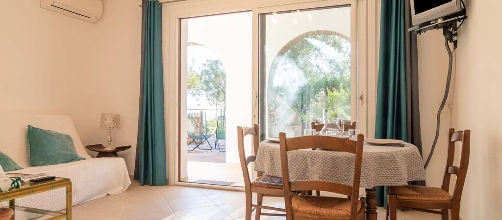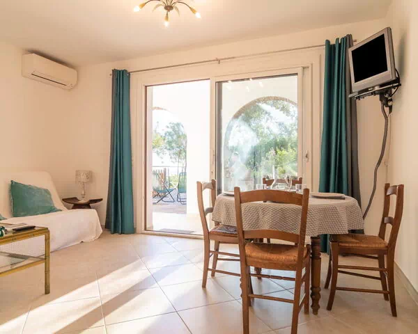 Der Garten wird von den Gästen gemeinsam genutzt und bietet einen großzügigen, grünen Bereich zum Entspannen. Die Nähe zum Meer ermöglicht es, den Strand „du Rayol" in etwa 400 m Entfernung zu erreichen.
