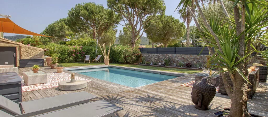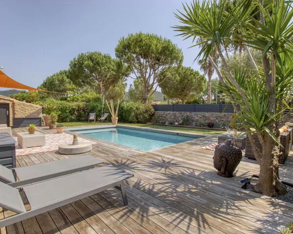 Das Außengelände der Villa „la Choupette" umfasst ein eingezäuntes Grundstück von 500 Quadratmetern, das Abgeschiedenheit und Freiraum bietet. Der private, winkelige Pool misst 4 x 7 Meter und hat eine Tiefe zwischen 100 und 180 Zentimetern; er ist vom 5. Juli bis 16. August verfügbar und mit einem Alarmsystem ausgestattet. Der großzügige Garten rund um die Villa bietet reichlich Platz zum Entspannen und für Aktivitäten im Freien.