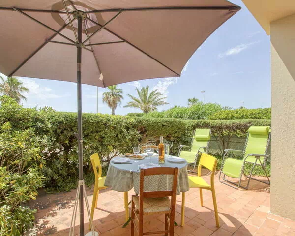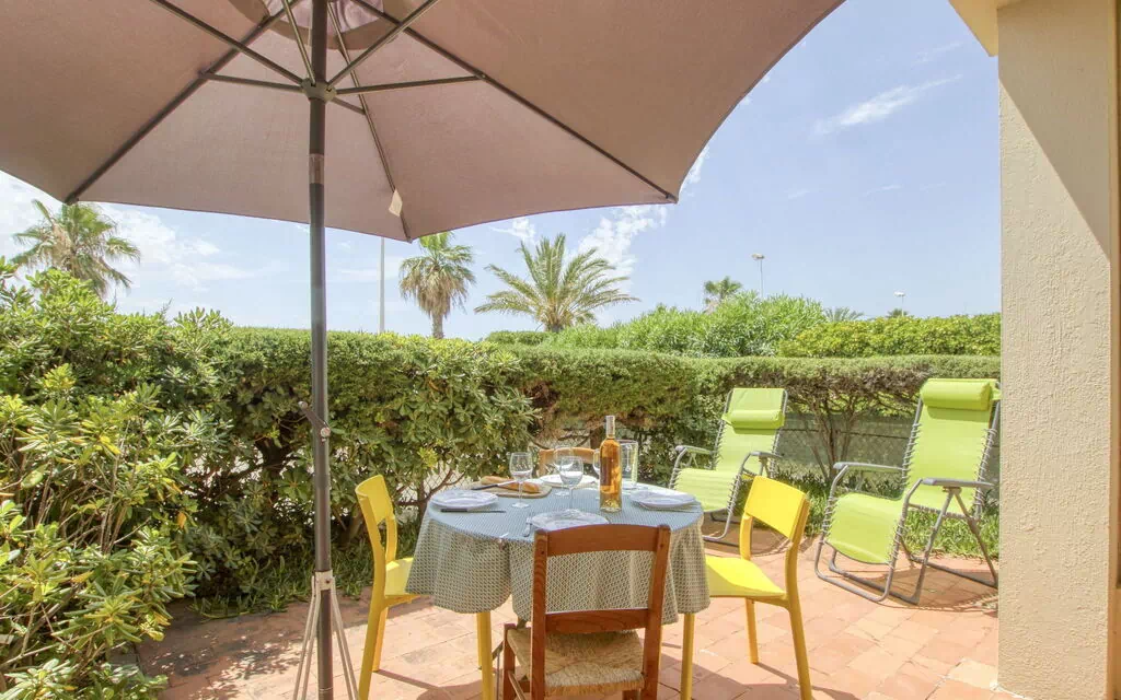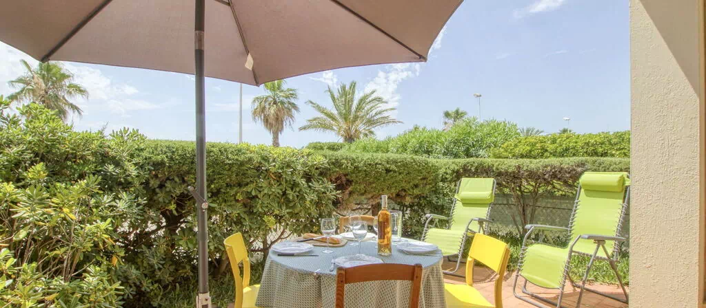 Das Außengelände von „Les Vagues" präsentiert sich als angenehmer Rückzugsort nach Tagen an der Küste. Der Sandstrand von Les Lecques liegt nur 50 Meter entfernt, jenseits der Straße, sodass das Meer unmittelbar vor der Tür liegt. Die Umgebung wird durch die Küstenlandschaft des Resorts geprägt.