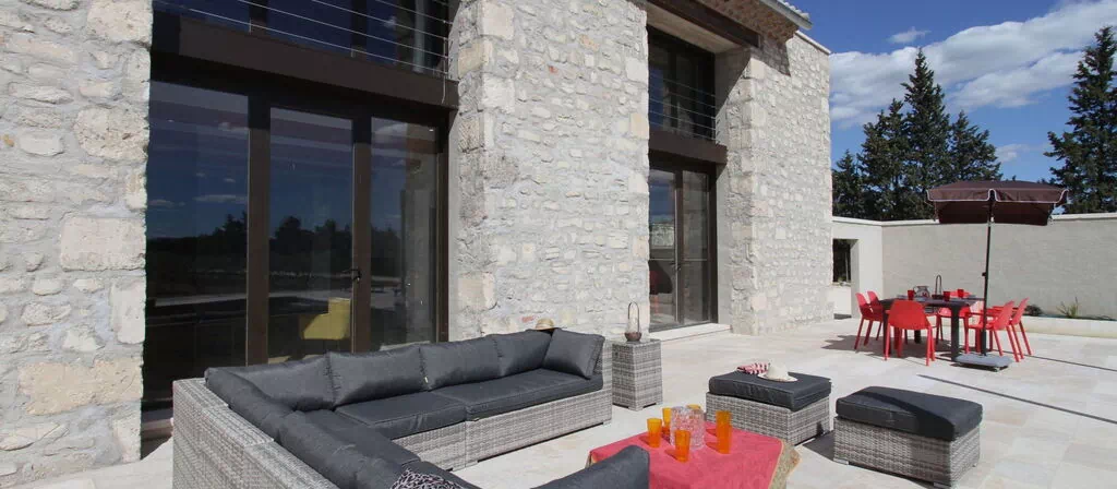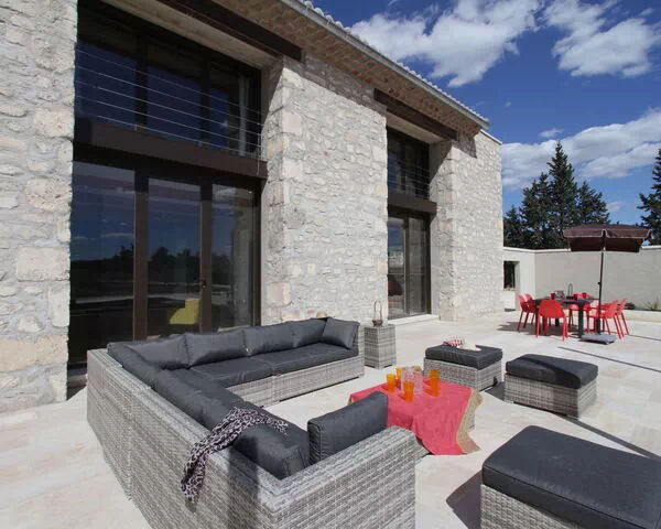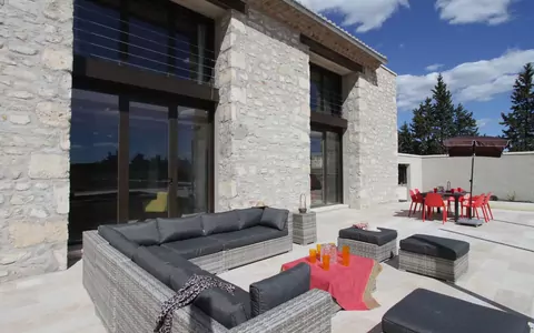 Mas "Bosana", built in 2018. Outside the resort, in a secluded position, in the countryside. Private: property 10'000 m2 (fenced), swimming pool heated (6 x 15 m, depth 150 cm, 15.03.-01.11.) with internal staircase and shutter cover. Pool house with shower and WC, table tennis, terrace (700 m2), garden furniture, barbecue. In the house: air conditioning, burglar alarm system. House maid on request (extra). Shop 2 km, restaurant 2 km. Nearby attractions: Avignon 12 km, Saint Rémy de Provence 13 km. Please note: The pool is heated at 25 ° C minimum, from April to November. At disposal: games of swimming pool, plancha, 4 bicycles.