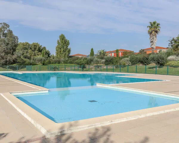 Den delte svømmepøl måler 23 x 15 meter med en dybde på 80 til 150 cm og er tilgængelig fra 1. juni til 30. september; en børnepøl er tilknyttet. En bruser og WC befinder sig i umiddelbar nærhed af poolområdet. Ejendommen ligger inden for et naturområde med en naturlig sø, som skaber et roligt og idyllisk miljø. Området er omgivet af gamle træer, der giver skygge og en følelse af afskærethed.