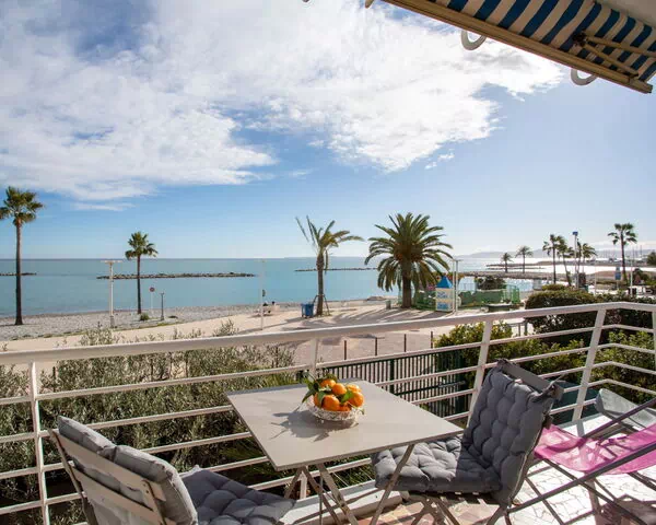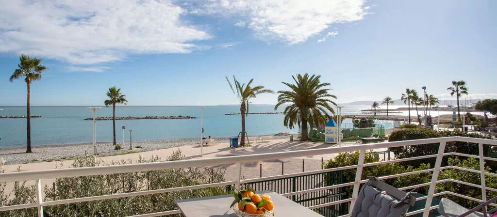 Stranden ligger blot få meter fra komplekset; det er en strandgrund med skaller, der strækker sig langs denne berømte del af Côte d'Azur. Direkte strandadgang fra komplekset gør Middelhavskysten til en naturlig forlængelse af boligen. Det omgivende område uden gennemgangstrafik, blot 20 meter væk, skaber et roligt miljø velegnet til aftenture og udendørs ophold.