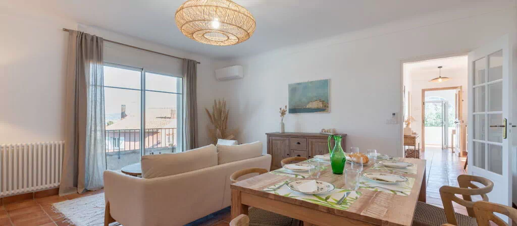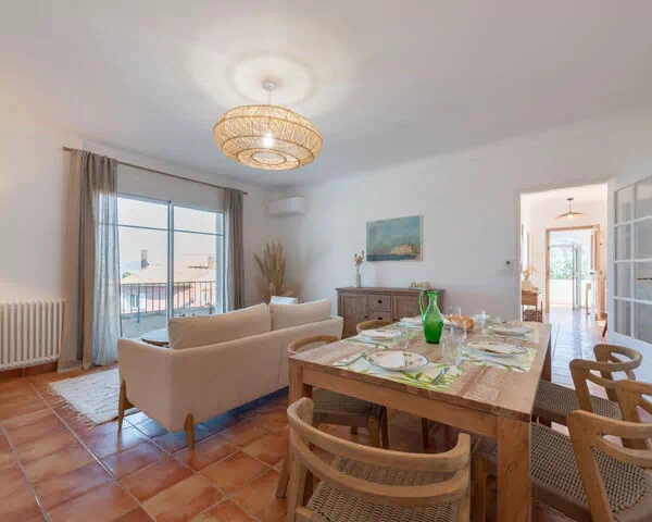 Ferielejligheden omfatter 150 m² på stueetagen og er indrettet som 4-værelses lejlighed med plads til maksimalt 6 gæster fordelt på 3 soveværelser og 2 badeværelser. Entréhallen åbner sig med et pejs med åbent ildsted, som udelukkende tjener dekorative formål. Det rummeligt stue- og spisestue er udstyret med fladskærmsfjernsyn og giver direkte adgang til en 6 m² balkon med delvis havudsigt og sydvestlig samt østlig orientering. Det første soveværelse er møbleret med 1 fransk seng på 160 cm × 200 cm og har tilknyttet eget badeværelse med bruser og separat WC. Det andet soveværelse har ligeledes 1 fransk seng på 160 cm × 200 cm. Det tredje og største soveværelse er udstyret med 2 enkeltsenge à 90 cm × 190 cm. Et andet badeværelse med bruser og separat WC betjener de øvrige soveværelser. Køkkenet råder over en ovn, en opvaskemaskine, 3 keramiske glaskogeplader, en brødrister, en elkedel, en mikrobølgeovn, en fryseboks og en elektrisk kaffemaskine; Nespresso-kapsler fås mod merpris. Lejligheden har adgang til en 400 m² have.