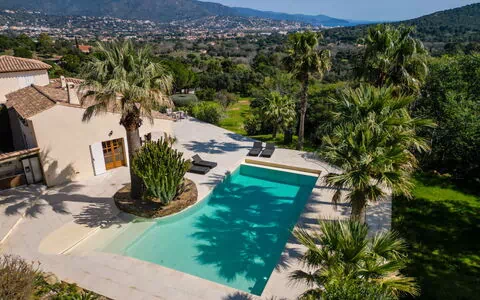 Bormes-Les-Mimosas: Smuk, hyggeligt, komfortabelt villa "Villa Resedas", på 2 etager. Rolig beliggenhed, 4 km fra havet, 4 km fra stranden, retning øst. Til alene benyttelse: grund 3 ha, pool (80 - 200 cm dyb, Sæsonbestemt tilgængelighed: 01.Jun. - 30.Sep.) med alarmanlæg. Poolhus med køleskab og kogeplade, petanque, grill, Underholdning af poolen af ejeren/gartneren. 750 m lang, smal tilkørsel. Parkeringsplads på grunden, single garage. Supermarked 3 km, bageri 4 km, busstoppested "Les Pins Fontète" 3 km, sandstrand "du Lavandou". Nærliggende attraktioner: Saint Tropez 40 km, Magic World 25 km, Parc Olbius Riquier 20 km, Le Jardin des Méditerranées 18 km. Vandrestier Sentiers du Littoral. Bemærk venligst: bil anbefales. Ejeren accepterer ikke nogen ungdomsgrupper. Nøgleoverrækkelsen finder sted på kontoret Interhome Le Lavandou, 5 km borte.
