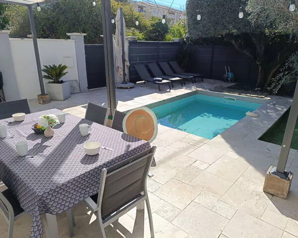 Saint Raphaël: Enfamiliehus "Villa Clem", på 2 etager, renoveret i 2022. I bymidten fra Saint-Raphael, rolig beliggenhed, 1.1 km fra havet, i en blind vej. Til alene benyttelse: velplejet have 80 m2 (indhegnet), pool kantet (4 x 3 m, 12 m2, Sæsonbestemt tilgængelighed: 01.Jun. - 01.Sep.) med alarmanlæg. Terrasse, havemøbler. Fødevarebutik, bageri 200 m, busstoppested "Maréchal Leclerc" 50 m, banegård "Saint Raphael" 4 km. Lystbådhavn 1 km, golfbane (18 hul) 10 km, tennis 10 km. Nærliggende attraktioner: aqualand 8 km, karting 8 km. Kendte søer nås nemt: Gorges du Verdon 85 km. Vandrestier L'Estérel 6 km. Bemærk venligst: bil anbefales. Ejeren accepterer ikke nogen ungdomsgrupper.