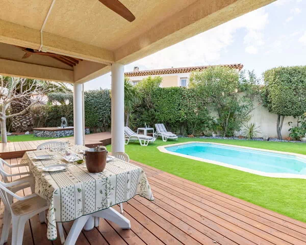 La piscina privada angular mide 3 x 4 m con una profundidad uniforme de 130 cm y está disponible del 16 de abril al 1 de octubre; cuenta con un sistema de alarma dedicado. Los terrenos vallados de 575 m2 ofrecen un amplio espacio para la relajación al aire libre, el descanso y las comidas al fresco. El patio bien mantenido crea un entorno exterior acogedor y privado.