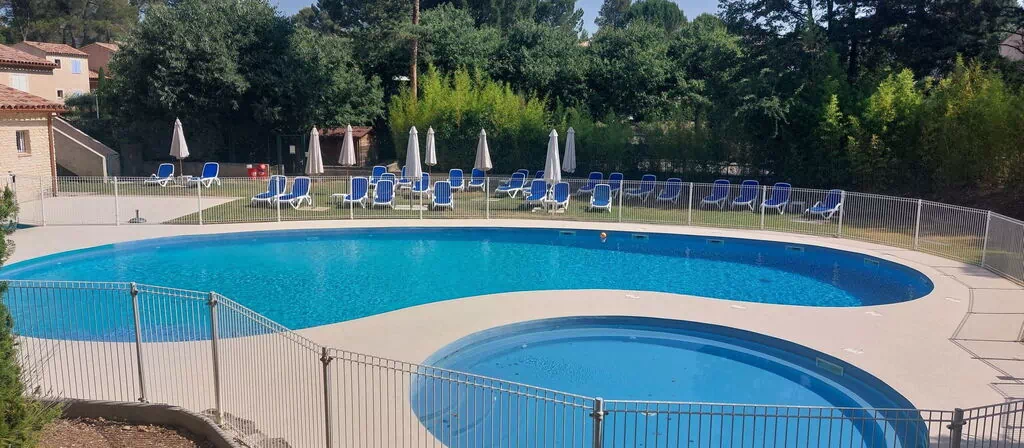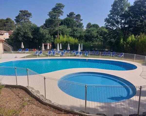 La piscina vallada constituye el centro del espacio exterior comunitario y está disponible del 1 de mayo al 1 de octubre. El complejo ofrece acceso a instalaciones de tenis de mesa y boccia. Los terrenos bien mantenidos de "Le Jardin du Golf" crean un entorno acogedor y verde, ideal para paseos tranquilos y comidas al aire libre. El complejo cuenta con 2 pistas de cemento disponibles para los huéspedes.
