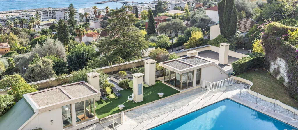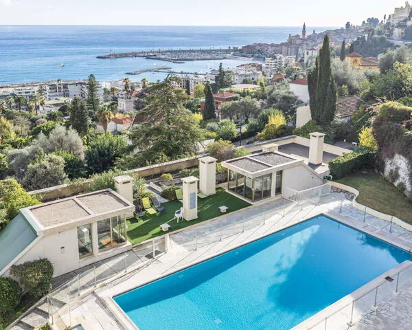 Los espacios exteriores de "Les Miradors" constituyen un punto destacado de la villa, ofreciendo a los huéspedes un entorno refinado y relajante dentro del amplio parque compartido de 2 hectáreas. La piscina mide 18 x 7 metros con una profundidad que oscila entre 60 y 200 cm, y está disponible de forma estacional del 15 de junio al 30 de septiembre; se accede a ella mediante una escalera interna dedicada. La terraza compartida proporciona un espacio acogedor para cenas al aire libre, tomar el sol o simplemente disfrutar de las vistas panorámicas que ofrece la posición elevada y orientada al sur de la propiedad. El parque circundante crea un refugio natural tranquilo que complementa perfectamente el paisaje mediterráneo y la atmósfera residencial serena del barrio de Garavan.