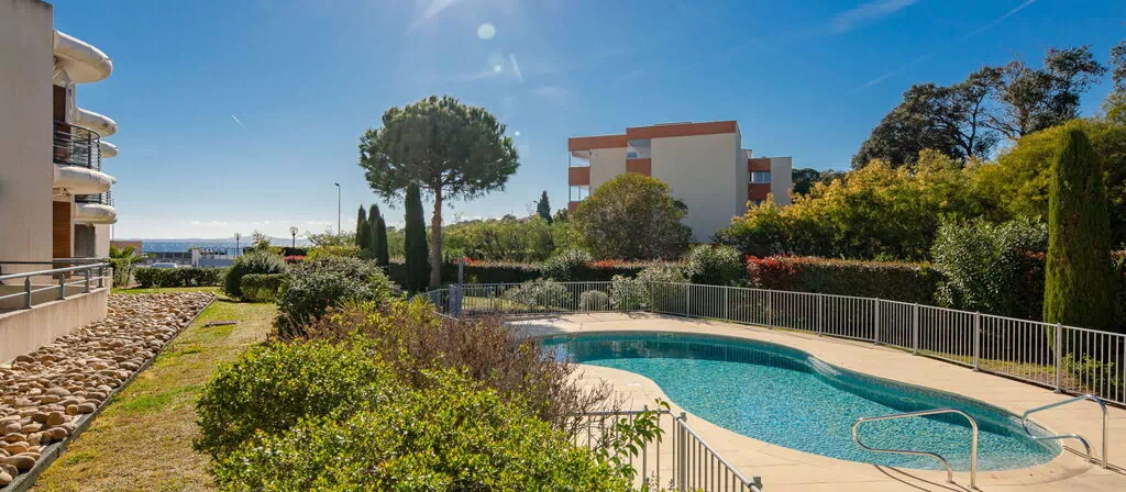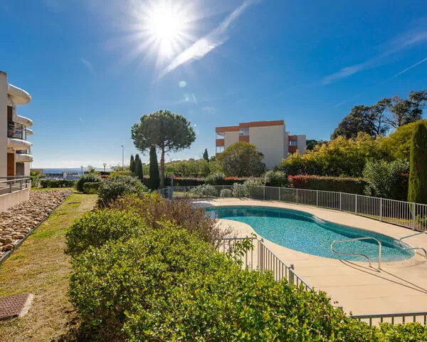 La piscina compartida, de forma arriñonada y vallada de forma segura, mide 10 x 4 metros y está disponible del 15 de mayo al 30 de septiembre, con horario de acceso de 08:00 a 19:00. La orientación suroeste del edificio asegura que las áreas exteriores reciban luz solar durante la tarde y la noche. La playa de Péguière se encuentra a tan solo 25 metros de la propiedad, accesible tras cruzar una carretera.