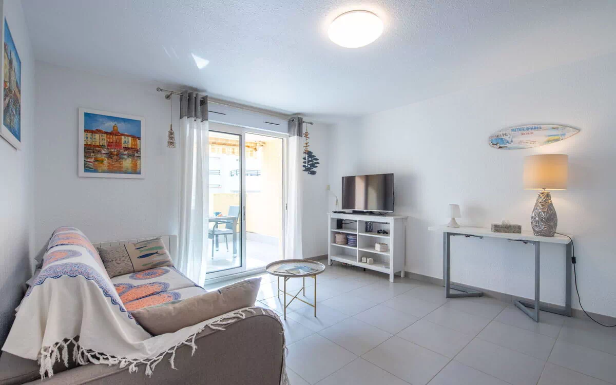 Apt 2 pièces 47 m2 au 2ème étage. Aménagement agréable: séjour avec 1 divan-lit double (1 x 160 cm, longueur 200 cm), TV (écran plat). Sortie sur la terrasse. 1 chambre avec 1 grand-lit (1 x 160 cm, longueur 200 cm), ventilateur. Cabine avec 2 lits (90 cm, longueur 190 cm). Cuisine ouverte (four, lave-vaisselle, 3 plaques à induction, grille-pain, bouilloire électrique, micro-ondes, congélateur, cafetière électrique, Capsules pour machine à café (NESPRESSO) (NON INCLUSES)). Douche, WC séparé. Chauffage électrique. Terrasse 14 m2, couverte, situation sud-est. Meubles de terrasse. A disposition: lave-linge, fer à repasser, sèche-cheveux. Internet (Connexion WIFI, gratuit). Place de parking No 31 (cloturée, 2 Voitures). Veuillez noter: logement non-fumeur. 1 animal/ chien de petite taille autorisé. Détecteur de fumée. Au lieu d'une chambre fermée, des espaces de couchage sont situés dans une zone ouverte (galerie, alcôve...). Annonce d'un particulier (art 155, IV du CGI).