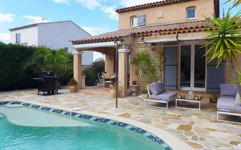 Cette villa s'étend sur 130 m² répartis sur 2 niveaux et accueille un maximum de 6 hôtes, avec 3 chambres et 2 salles de bains. Le rez-de-chaussée comprend un séjour et une salle à manger spacieux et lumineux avec téléviseur écran plat, ouvrant directement sur la terrasse avec vue sur la piscine. Une chambre au rez-de-chaussée est équipée d'un lit français de 160 cm de largeur et 200 cm de longueur, d'une salle de bains privative et d'un téléviseur écran plat. La cuisine ouverte, entièrement équipée, communique avec le séjour. Un WC séparé complète l'aménagement du rez-de-chaussée. Le premier étage accueille une deuxième chambre avec un lit français de 160 cm de largeur et 200 cm de longueur et un téléviseur écran plat. La troisième chambre est aménagée avec 2 lits simples de 80 cm de largeur et 190 cm de longueur chacun, ainsi qu'un téléviseur écran plat. Une salle de bains avec double vasque et un WC séparé desservent le premier étage. Une terrasse couverte orientée sud, de 15 m², est accessible depuis la villa et aménagée avec du mobilier de terrasse et 2 transats ; elle offre une vue sur la piscine.