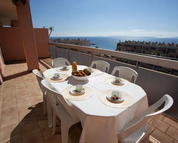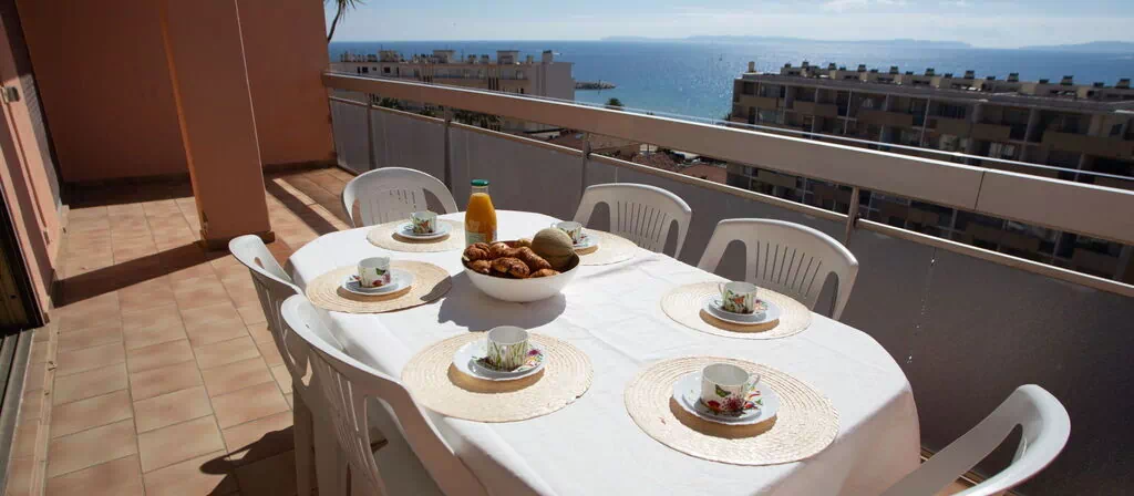 L'appartement s'étend sur 60 m² et occupe le 8e étage de l'immeuble. Il accueille un maximum de 6 hôtes et comprend 3 pièces : 2 chambres et 1 salle de bains. Le séjour-salle à manger est aménagé avec un canapé-lit double de 140 cm de largeur et 190 cm de longueur, offrant une flexibilité pour les couchages supplémentaires. Cet espace ouvre directement sur une grande terrasse sud de 15 m² équipée de mobilier de jardin et offrant une vue panoramique sur la mer. La première chambre est dotée d'un lit à la française de 140 cm de largeur et 190 cm de longueur et bénéficie également d'un accès direct à la terrasse. La deuxième chambre est équipée d'un ensemble de lits superposés avec 2 couchages de 90 cm de largeur et 190 cm de longueur chacun, avec accès à une loggia. La salle de bains est équipée d'une douche et d'un WC séparé. La cuisine, de petite taille, dispose de 4 plaques de cuisson, d'un four, d'un grille-pain, d'une bouilloire et d'une cafetière électrique. L'appartement est orienté sud avec vue panoramique sur la mer.