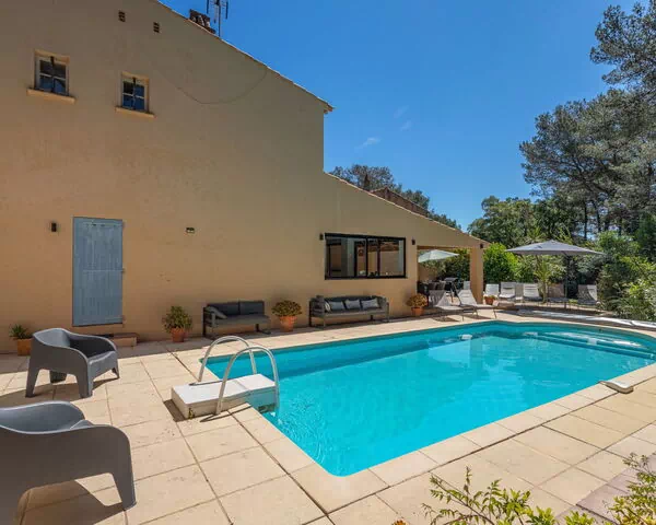 Villa 6 pièces 150 m2 sur 2 niveaux. Aménagement agréable: séjour/salle à manger avec cheminée (uniquement à titre de décoration), TV (écran plat). Sortie sur la terrasse. 2 chambres, chaque chambre avec: 1 grand-lit (140 cm, longueur 200 cm). Sortie sur le jardin. 1 chambre avec 1 grand-lit (140 cm, longueur 200 cm), douche. Sortie sur la piscine. Cuisine ouverte (four, lave-vaisselle, 4 plaques à induction, grille-pain, bouilloire électrique, micro-ondes, congélateur, cafetière électrique). WC séparé. À l'étage supérieur: 1 chambre avec 1 grand-lit (180 cm, longueur 200 cm). 1 chambre avec 1 grand-lit (160 cm, longueur 200 cm). Sortie sur le balcon. Salle de bains, douche, WC séparé. Chauffage électrique. Terrasse 30 m2, couverte. Meubles de terrasse, barbecue, chaises longues (6). A disposition: lave-linge, sèche-linge, fer à repasser, chaise haute pour enfant, lit bébé, sèche-cheveux. Internet (Connexion WIFI, gratuit). Place de parking (2 Voitures). Veuillez noter: une chambre double est à l'exterieur de l'appartement. Logement non-fumeur. Détecteur de fumée. Annonce d'un particulier (art 155, IV du CGI). 83065000184RK