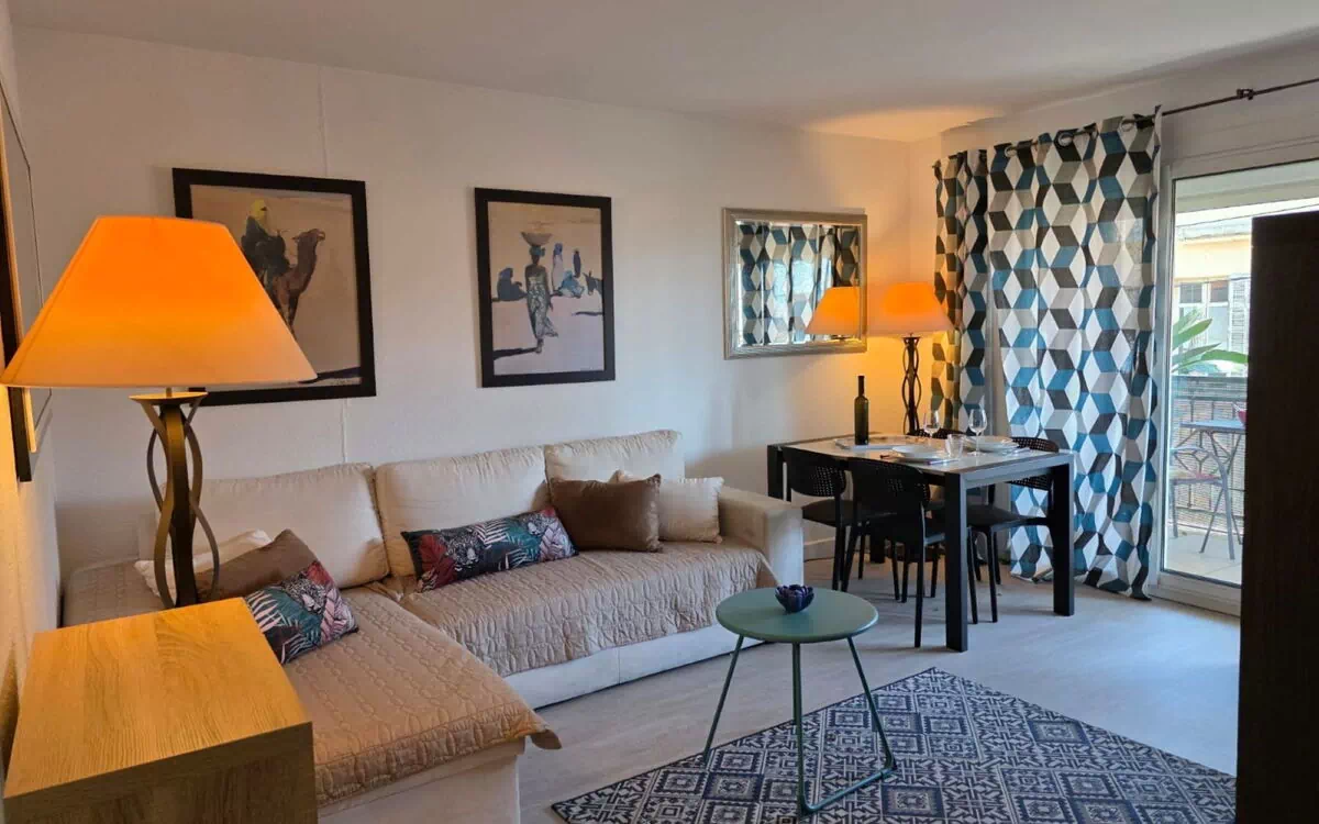 Apt 2 pièces 45 m2 au 2ème étage. Aménagement confortable et agréable: séjour/salle à manger avec TV (écran plat), air-conditionné. Sortie sur le balcon. 1 chambre avec 1 grand-lit (140 cm, longueur 190 cm), air-conditionné. Cuisine (four, lave-vaisselle, 3 feux, grille-pain, bouilloire électrique, micro-ondes, congélateur, cafetière électrique, Capsules pour machine à café (Nespresso) (NON INCLUSES)). Douche, WC séparé. Air-conditionné, chauffage à air chaud. Balcon 10 m2. Mobilier de balcon. Vue latérale sur la mer. A disposition: lave-linge, sèche-cheveux. Internet (Connexion WIFI, gratuit). Place de parking (1 Voiture). Veuillez noter: détecteur de fumée. Annonce d'un particulier (art 155, IV du CGI). 06029024727MX