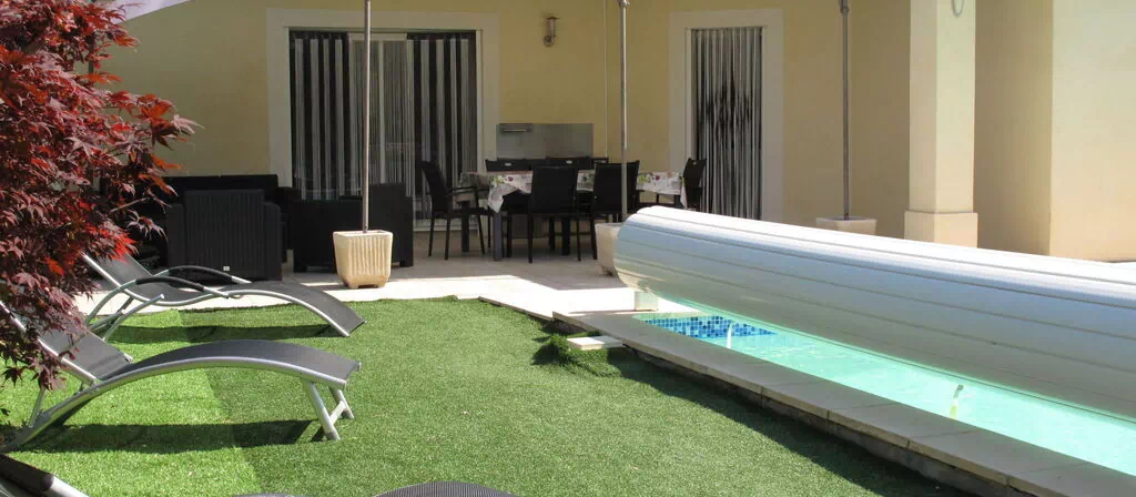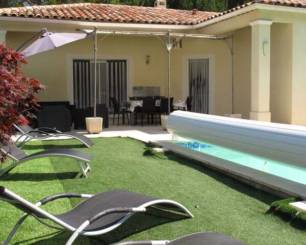 "Au Romarin" è una casa vacanze moderna costruita nel 2011, situata nel tranquillo quartiere residenziale di Bagnols-en-Forêt, nel cuore dell'entroterra della Costa Azzurra. La proprietà sorge su un terreno completamente recintato di 1.200 m² e comprende un ampio giardino naturalistico che si integra armoniosamente con il paesaggio circostante. La piscina privata, elemento centrale dello spazio esterno, misura 10 x 5 metri con profondità di 150 cm ed è disponibile tutto l'anno. La casa rappresenta una raffinata soluzione per chi ricerca comfort, privacy e contesti naturali nel sud della Francia.