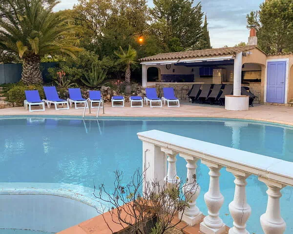Het privézwembad meet 11 x 4 meter met een diepte van 130 tot 190 centimeter en is beschikbaar van 1 mei tot 31 oktober; het zwembad beschikt over een onconventionele vorm en een zout-elektrolyse reinigingssysteem. Een buitendouche bevindt zich in de buurt van het zwembad, en een poolhouse met koelkast biedt praktische voorzieningen voor buitenactiviteiten. De tuin is voorzien van tuinmeubilair en biedt ruimte voor boulesspel; een barbecueplaats nodigt uit tot buitendinen.