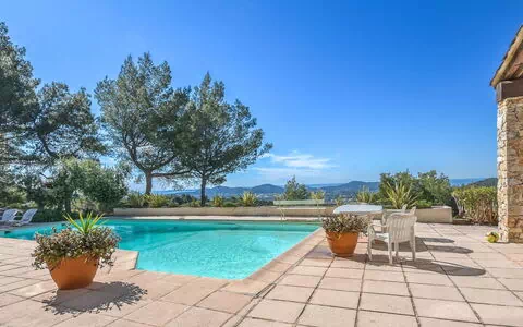 Het terras meet 200 m² en biedt uitzicht op zee, bergen en vallei, met directe toegang tot het zwembad. De inrichting van de villa heeft een rustiek en verfijnd karakter. De steile trap naar de derde verdieping dient in aanmerking te worden genomen, met name voor gasten met mobiliteitsbeperkingen of jonge kinderen.