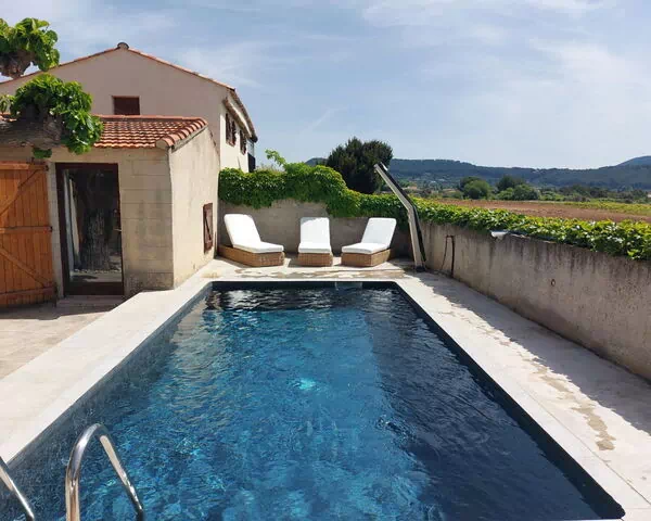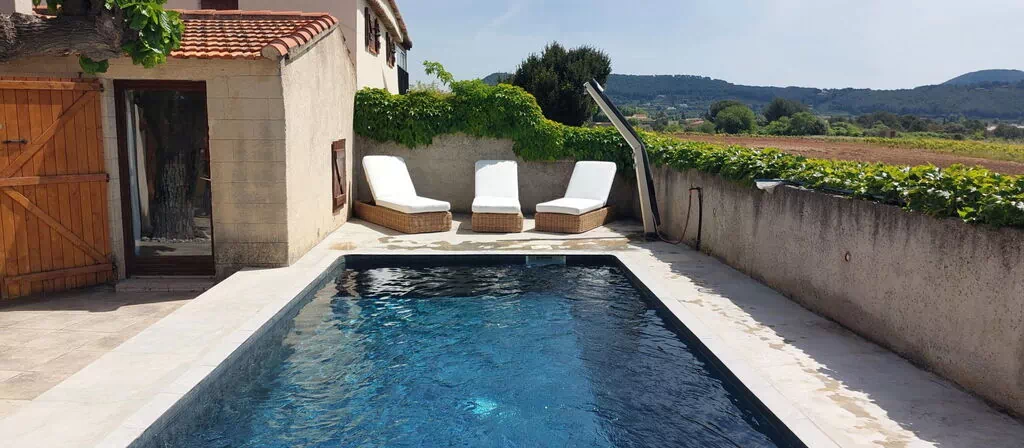 Het zwembad meet 6 x 3 meter met een diepte van 150 cm en is het hele jaar beschikbaar. Een buitendouche bevindt zich op het terrein. Het terras biedt een aangename plek voor buitendinen en ontspanning met uitzicht op velden en wijngaarden. Het gehele terrein is omheind, wat privacy en rust garandeert.