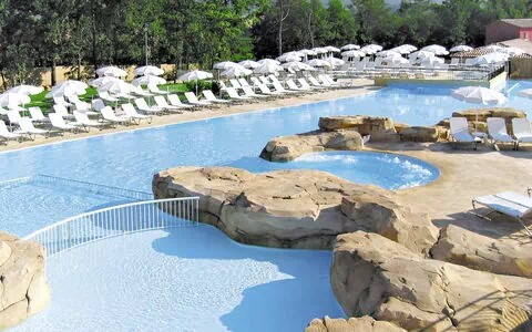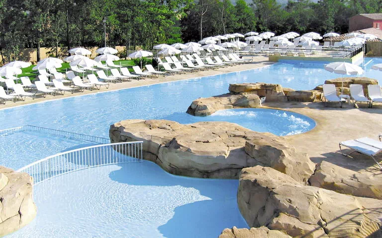 Het zwembad meet 600 vierkante meter en is beschikbaar van 4 april tot 26 september; een apart kinderzwembad zorgt voor veilig waterplezier voor jonge gasten. Een terras van 700 vierkante meter biedt volop ruimte voor zonnebaden, sociale activiteiten en buitendinen. Het terrein beschikt over een tennisbaan, een tafeltennistafel en bocciafaciliteiten voor gedeeld gebruik. De groene omgeving van het complex draagt bij aan een rustige en schilderachtige sfeer.