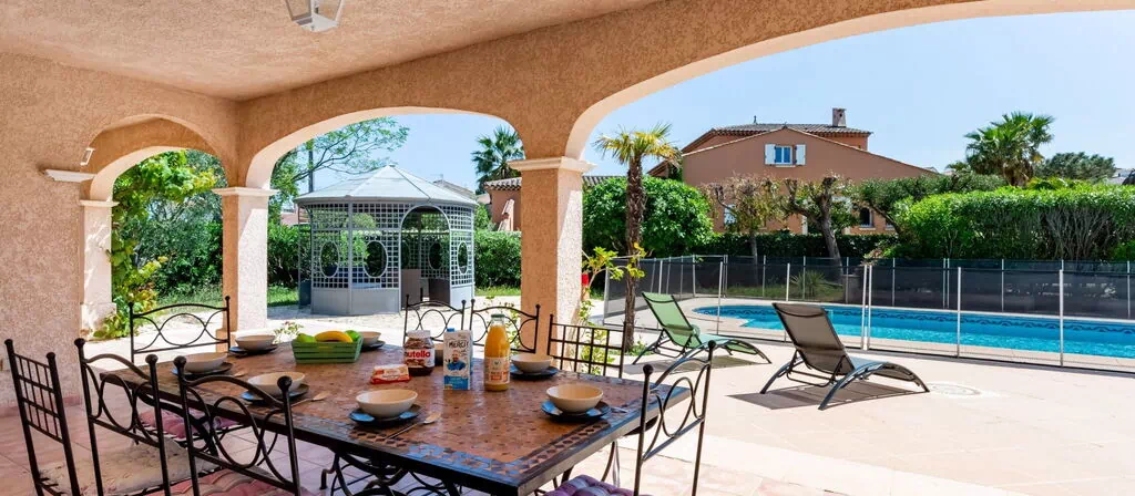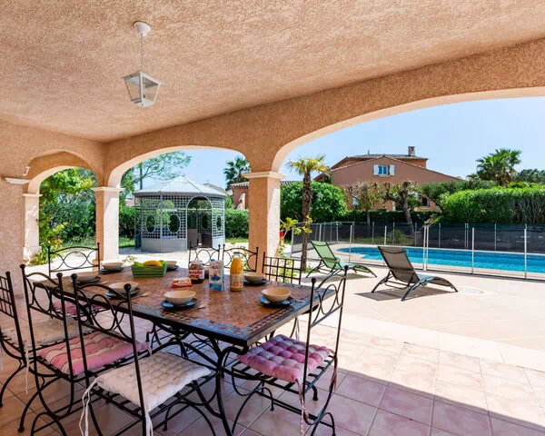 Villa "Massenet" is een elegant vakantiehuis gebouwd in 2002, gelegen in een rustige woonwijk van Saint Aygulf in Frankrijk. Het pand ligt ongeveer 1,5 km van het centrum van Saint Aygulf en slechts 2 km van de zee, wat een uitstekende combinatie biedt van nabijheid van voorzieningen en de rust van een rustige buurt. De villa staat op een volledig omheind privéterrein van 1.100 m², wat ruimte en privacy garandeert. Het meest opvallende kenmerk is het hoekige zwembad met zoutwater, dat het middelpunt van de tuin vormt.