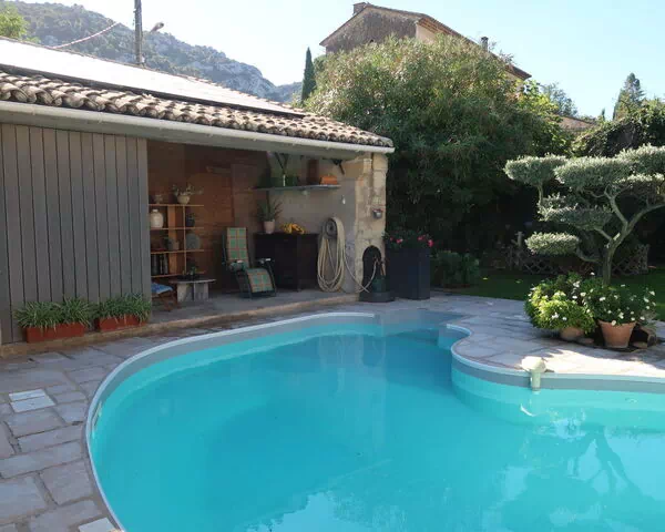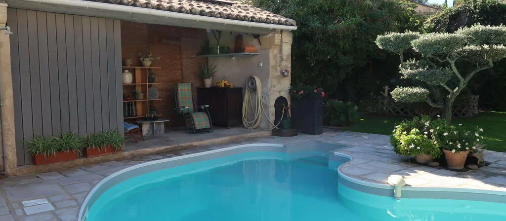 Het privézwembad meet 7 x 4 meter met een diepte van 90 tot 155 centimeter en is beschikbaar van 1 mei tot 15 oktober. Een terras met tuinmeubilair biedt een ideale plek voor buitendinen en ontspanning. Het gedeelde omheinde terrein van 200 vierkante meter is voorzien van een gazon en zorgvuldig onderhouden planten. Een sierlijke vijver met goudvissen vormt een rustgevend element in de tuin.