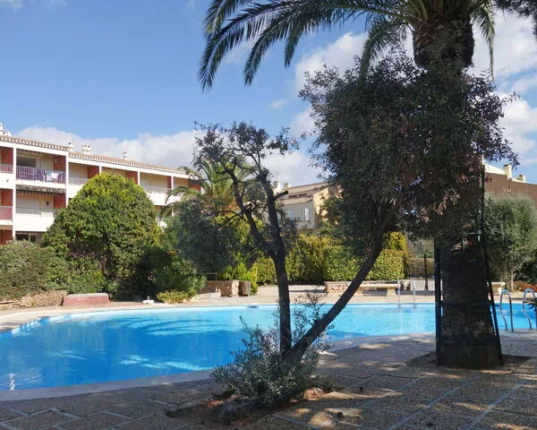Het gedeelde niervormige zwembad, omgeven door een veilig hek, is het middelpunt van de buitenruimte en is beschikbaar van 1 mei tot 30 september; lifeguardbewaking is aanwezig in juli en augustus. Het terrein beschikt over een boccibaan voor recreatie. Het vakantiehuis ligt op slechts 300 m van een kiezelstrand dat te voet bereikbaar is via een poort; het bekende zandstrand "Renecros" ligt ongeveer 900 m verderop en is eveneens te voet toegankelijk. De omgeving, omlijst door het natuurlijke landschap van Zuid-Frankrijk, creëert een serene buitenomgeving.