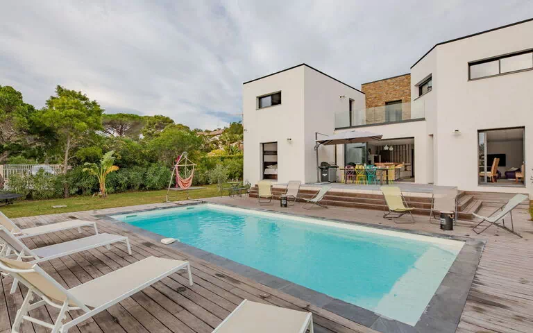 "Les Girelles", villa 6-kamers 230 m2 op 2 verdiepingen. Ruim, zeer modern en stijlvol ingericht: groot woon-/eetkamer met Digitale TV, Flatscreen TV en air-conditioning. Uitgang naar het terras. 1 kamer met 1 2-pers bed (160 cm, lengte 200 cm), douche/WC en air-conditioning. Uitgang naar het terras. 1 kamer met 2 bedden (80 cm, lengte 200 cm), air-conditioning. Uitgang naar de tuin. Open keuken (oven, afwasmachine, 4 inductiekookplaten, broodrooster, diepvriezer, elektrische koffiemachine, kookeiland). Uitgang naar het terras. Aparte WC. Bovenverdieping: 1 kamer met 1 2-pers bed (160 cm, lengte 200 cm), air-conditioning. 1 kamer met 1 2-pers bed (160 cm, lengte 200 cm), air-conditioning. Uitgang naar het balkon. 1 kamer met 1 2-pers bed (160 cm, lengte 200 cm), bad/douche/WC, dubbele wastafels en air-conditioning. Uitgang naar het balkon. Douche/WC. Elektrische verwarming, air-conditioning. Groot balkon 20 m2, op het zuiden gelegen, groot terras 30 m2 gedeeltelijk overdekt, op het zuiden gelegen. Panoramazicht op zee. Ter beschikking: wasmachine. Internet (Internet (WiFi), gratis). Rookvrij huis. Rookmelders. Aanbod door een commerciële eigenaar volgens art. 155, IV, CGI 83107001116R1