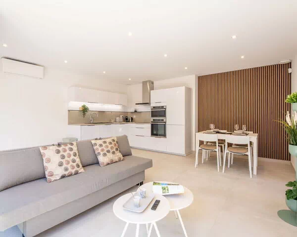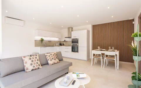 "Kaori", appartement 2-kamers 47 m2, op de begane grond, op het oosten gelegen. Ruim, volledig gerenoveerd in 2024, mooi en modern ingericht: woon-/eetkamer met 1 2-pers divanbed (1 x 140 cm, lengte 190 cm), TV (Flatscreen TV). Uitgang naar de tuin. 1 kamer met 1 2-pers bed (1 x 160 cm, lengte 200 cm). Uitgang naar de zitplaats in de tuin. Open keuken (oven, afwasmachine, 3 inductiekookplaten, broodrooster, waterkoker, magnetron, diepvriezer, elektrische koffiemachine). Douche, aparte WC, dubbele wastafels. Air-conditioning, heteluchtverwarming. Tuin 80 m2, op het oosten gelegen. Terrasmeubelen. Ter beschikking: wasmachine, strijkijzer, haardroger. Internet (WiFi, gratis). Parkeerplaats. Niet rokers woning. Rookmelders. Aanbod door een commerciële eigenaar volgens art. 155, IV, CGI 83115005176SB