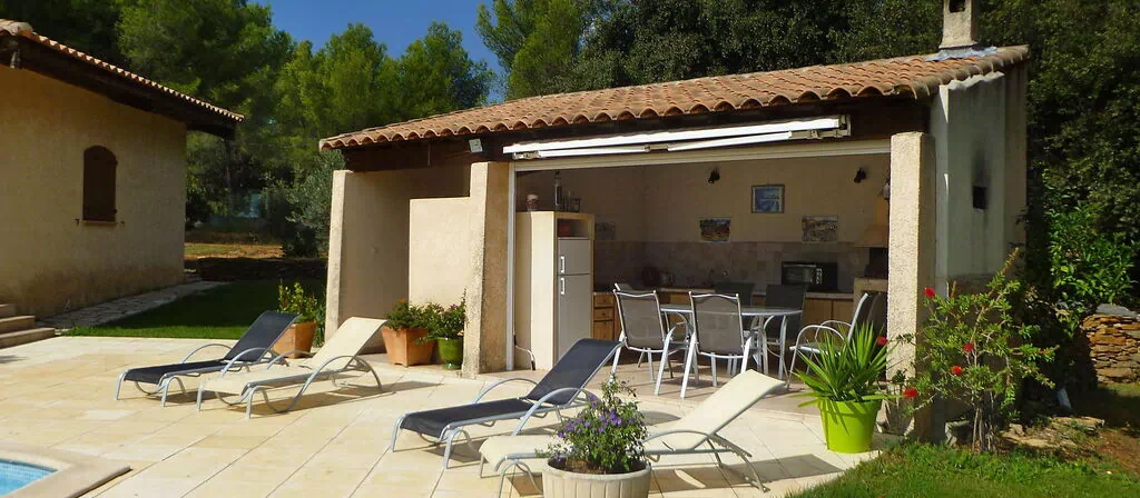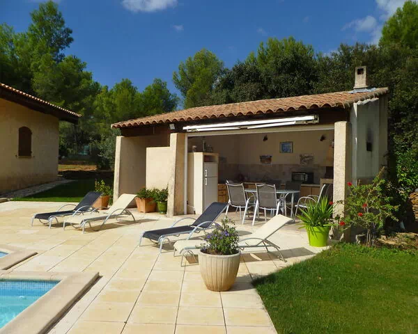 Het buitenterrein omvat een verzorgde tuin met een gazon van 1.000 m² op het omheinde landgoed van 5.000 m². Het zwembad meet 12 x 7 meter met een diepte van 150 tot 325 cm en is beschikbaar van 19 juni tot 4 september; het is voorzien van een veiligheidsalarmsysteem. Naast het zwembad bevindt zich een volledig uitgeruste poolhouse met koelkast, douche, toilet en kooktoestel. Het terrein biedt mogelijkheden voor het spelen van jeu de boules; een open haard voegt warmte en karakter toe aan de buitenruimte.