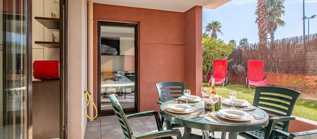 Appartement 2-kamers 46 m2, op de begane grond. Comfortabel en modern ingericht: woon-/eetkamer met 1 uitschuifbaar bed (2 x 90 cm, lengte 200 cm), TV en air-conditioning. Uitgang naar de tuin, naar het terras. 1 kamer met 1 2-pers bed (1 x 180 cm, lengte 200 cm), air-conditioning. Uitgang naar het terras. Open keuken (mini-oven, oven, 4 inductiekookplaten, magnetron, diepvriezer, elektrische koffiemachine) met eettafel. Douche/bidet/WC. Elektrische verwarming. Terras 14 m2, kleine tuin 40 m2. Terrasmeubelen. Ter beschikking: wasmachine, strijkijzer. Internet (WiFi, extra). Parkeerplaats nr. 4. Maximaal 1 huisdier/hond toegestaan. TV alleen FR. Rookmelders.