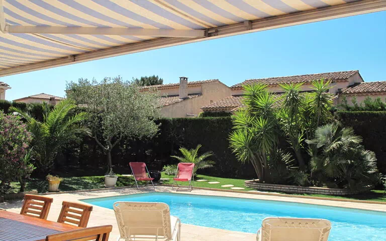 Beautiful house "Les Mazets du Soleil". 3 km from the centre of Sainte Maxime, 14 km from the centre of Grimaud, 15 km from the centre of Saint Tropez, in the residential district, 4 km from the sea, in a cul-de-sac. Private: property 500 m2 (fenced), well-kept garden, swimming pool fenced (8 x 4 m, 01.04.-31.10.). Outdoor shower, boules, parking on the premises, public parking on the road. Shop 3 km, sandy beach "La Nartelle" 4 km. The owner does not accept any groups.