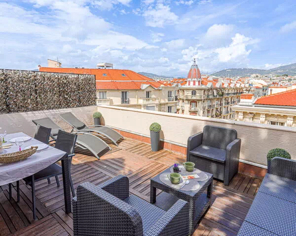 While the apartment itself is set within a multi-storey residential building, the surrounding outdoor environment offers a wealth of opportunities to enjoy the fresh Mediterranean air and the lively atmosphere of Nice. The shingle beach "Carras" is just 800 m away, inviting you to spend leisurely days by the sea. The iconic Promenade des Anglais, one of the most celebrated seafront promenades in the world, is equally within easy reach at 800 m, offering a scenic setting for morning walks or evening strolls along the coast.