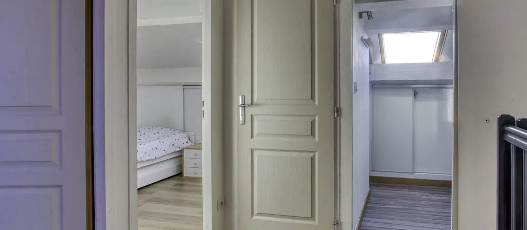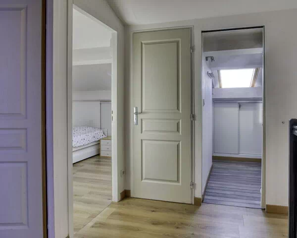 The upper floor features 2 additional bedrooms, both with sloping ceilings and rooflights that lend the space a distinctive character. The first of these rooms is furnished with 1 French bed measuring 160 cm in width and 200 cm in length, while the second is equipped with 1 pull-out bed suitable for 2 persons, composed of 2 single sections each measuring 90 cm in width and 190 cm in length. A shower room and a separate WC serve this floor.
