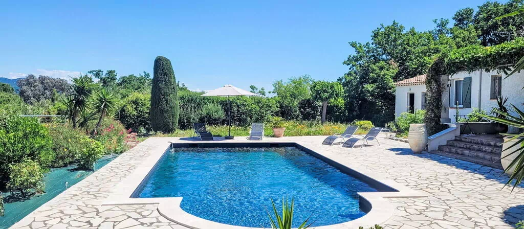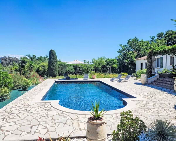The outdoor spaces of villa "Aurval" are thoughtfully designed to complement the natural beauty of the surrounding landscape. The private terraced garden, extending across 1,500 m2, is carefully maintained and offers a serene environment in which to relax and unwind. While the garden is not fenced, it provides a sense of openness and connection with the peaceful residential surroundings. The angular swimming pool, measuring 10 x 5 m with a depth of 80 to 200 cm, is a central feature of the outdoor area and is available for use from 01 April to 30 October. The pool is fitted with an alarm system, adding an important layer of safety for all guests. For those who enjoy traditional outdoor leisure, a boules court is also available on the property, offering a quintessentially French recreational activity in a relaxed and convivial setting. The terraced layout of the garden creates distinct outdoor zones, ideal for sunbathing, al fresco dining, or simply enjoying the warm Mediterranean climate in complete privacy.