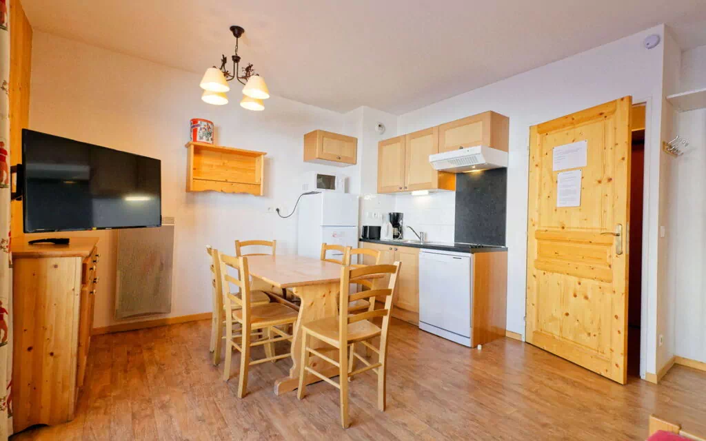 The T.Bergerie is a 2-room apartment with a living area of 36 square meters, situated on the 4th floor. It can comfortably accommodate up to 6 adults. The living room is equipped with a sofa bed, a 1x1 bunk bed, and a pull-out bed, along with a television set. Additionally, there is a separate bedroom with a double bed.