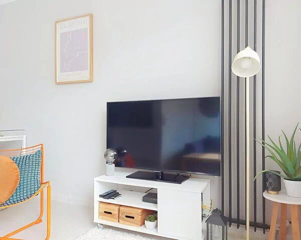 You will find a 2-room apartment spanning 35 square meters on the 5th floor. The living/dining area features a comfortable and modern double sofabed measuring 140 cm wide and 190 cm long, along with a flat screen television and a fan. Additionally, there is a separate bedroom with a double bed of the same dimensions (140 cm wide and 190 cm long) and another fan.