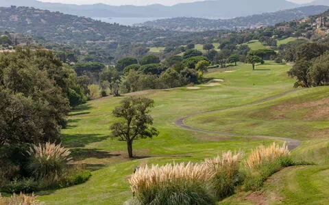 The property offers access to a shared angular swimming pool measuring 10 x 5 metres with a depth of 170 to 170 cm, featuring an internal staircase and alarm system, with seasonal availability from 01.Jun. to 30.Sep. The residence enjoys a privileged south-facing position on top of a hill within the golf course grounds, situated just 30 metres from an 18-hole golf course. The location provides easy access to a cycle lane 2 km away, while hiking enthusiasts can explore the Massif des Maures at 5 km and the Massif de l'Esterel at 23 km from the property.