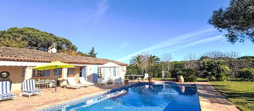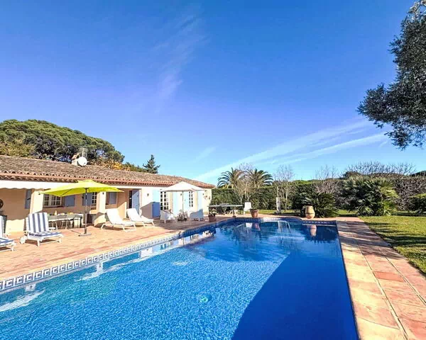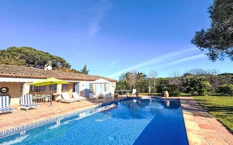 Le Grand Pin is a distinguished single-family house positioned in the serene countryside of Ramatuelle, France, surrounded by picturesque vineyards. This elegant holiday rental sits outside the resort area, 4 km from the centre of Ramatuelle, in a quiet position, 3 km from the sea and 3 km from the beach. The property features a well-kept private garden spanning 800 m2, completely fenced for your privacy and security. You will have access to an angular swimming pool measuring 12 x 6 m with depths ranging from 100 to 180 cm, available seasonally from 01.May. to 30.Sep. The property provides convenient parking facilities for your vehicle, reliable Internet Wifi connectivity throughout your stay, and the generous yard offers ample outdoor space for relaxation. Tennis enthusiasts will appreciate that tennis facilities are located just 2 km away.