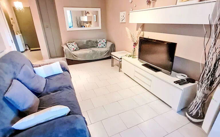 Your vacation accommodation is a comfortable 3-room apartment measuring 50 square meters, located on the 1st floor. The apartment features one room furnished with a double bed measuring 140 cm wide and 190 cm in length. The living and dining room is equipped with a double sofabed that measures 140 cm in width and 200 cm in length, along with a flat screen television and a fan, and provides direct exit to the terrace. An additional room contains a french bed measuring 140 cm wide and 200 cm long, complemented by a fan. The kitchenette comes equipped with an oven, dishwasher, 2 ceramic glass hob hotplates, toaster, microwave, freezer, and electric coffee machine. The bathroom facilities include a shower and a separate WC. The apartment also features electric heating for your comfort.