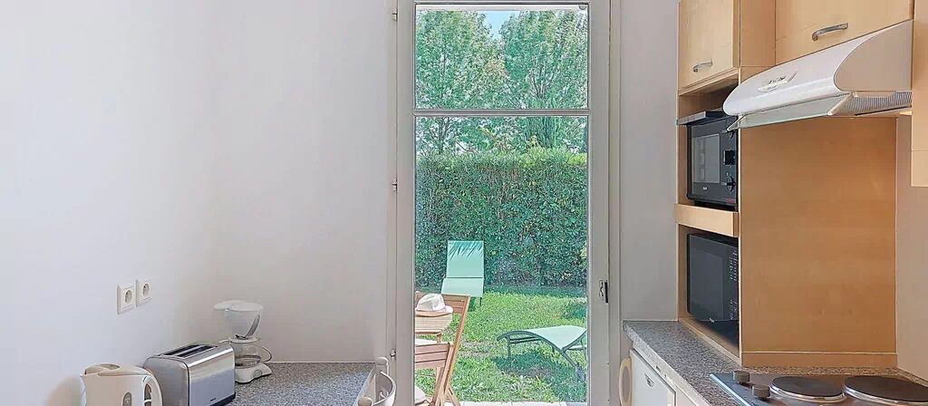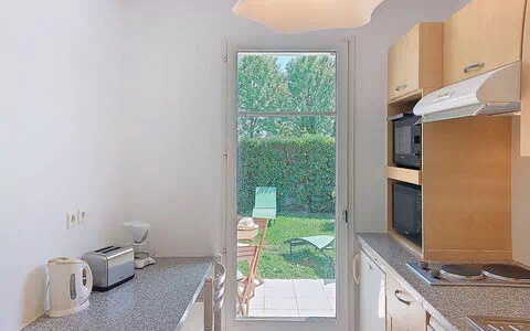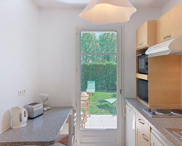 "Les Bastides" is a 2-room apartment of 44 m2 situated on the ground floor, designed to comfortably accommodate up to 4 guests. The apartment features 1 bedroom equipped with 2 single beds, each measuring 90 cm in width and 200 cm in length, with direct access to the terrace. The living and dining area serves as a versatile space, furnished with a double sofabed measuring 160 cm in width and 200 cm in length, a dining table, and direct access to the terrace, making it suitable for additional sleeping arrangements. The fully equipped kitchen also benefits from a direct exit to the terrace, creating a seamless indoor-outdoor flow throughout the apartment. The bathroom configuration includes 1 shower room accompanied by a separate WC. The outdoor space is a notable feature of this vacation rental, comprising a terrace of 17 m2 and a small private garden of 57 m2, both accessible from multiple rooms within the apartment.