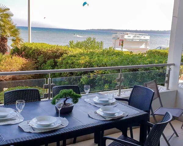 This fully renovated vacation rental is a 4-room apartment of 92 m2 situated on the first floor, comfortably accommodating up to 5 guests across 3 bedrooms and 2 bathrooms. The apartment was comprehensively renovated in 2015 and features modern, comfortable furnishings throughout. The living and dining room serves as the central gathering space, equipped with a satellite TV and flat screen television, and opens directly onto one of the property's terraces. The kitchen is large and open in design, fitted with an oven, a dishwasher, 3 induction hot plates, a microwave, and an electric coffee machine, making it fully equipped for self-catering stays. The first bedroom features 1 french bed measuring 160 cm and has direct access to a terrace. The second bedroom also features 1 french bed measuring 160 cm and similarly opens onto a terrace. The third bedroom is a smaller room furnished with 1 bed measuring 120 cm. All 3 bedrooms are equipped with individual air conditioning units. The apartment includes 2 bathrooms, one configured as a bath with WC and the other as a shower with WC. The property benefits from 2 private terraces measuring 12 m2 and 15 m2 respectively, both furnished with terrace furniture and offering a very beautiful view of the sea.